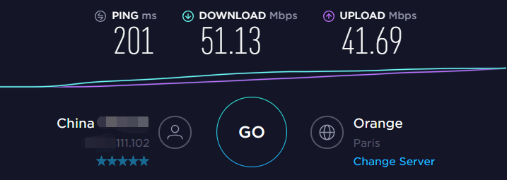 联通国际精品网专线60M带宽测速,服务器选择Orange-Paris,延迟约200ms,下载速度51M,上行速度42M